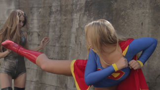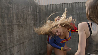 Solaria wakes to find herself detained in a chamber which appears to be pumping a greenish gas. Having breathed the gas for an unknown number of days, the effects have left her noticeably powerless. She immediately seeks an escape but the guard on duty puts a stop to any escape plans by knocking her unconscious. Unfortunately, after watching Solaria sleep for 3 days, he's aroused past the point of good judgment. He doesn't figure anyone will notice if he takes her into the observation booth and has a little fun. He figures the effects of the green gas will leave her with the strength of a normal girl. After a little fun, Solaria stirs and finds herself at the hands of a groping fan boy. Although not at full strength, she still takes care of the guard quickly and runs into the halls of the complex seeking an escape route. The guard sounds the escape alarm, and in her haste, Solaria finds herself in a walled off courtyard. In response to the alarm, 2 powerful villainesses are already waiting for her. The effects of the gas aren't going away quickly, and flight, laser eyes or super breathe don't seem to be options. With that she's forced to engage the two villainesses with her remaining strength in a fight for survival.